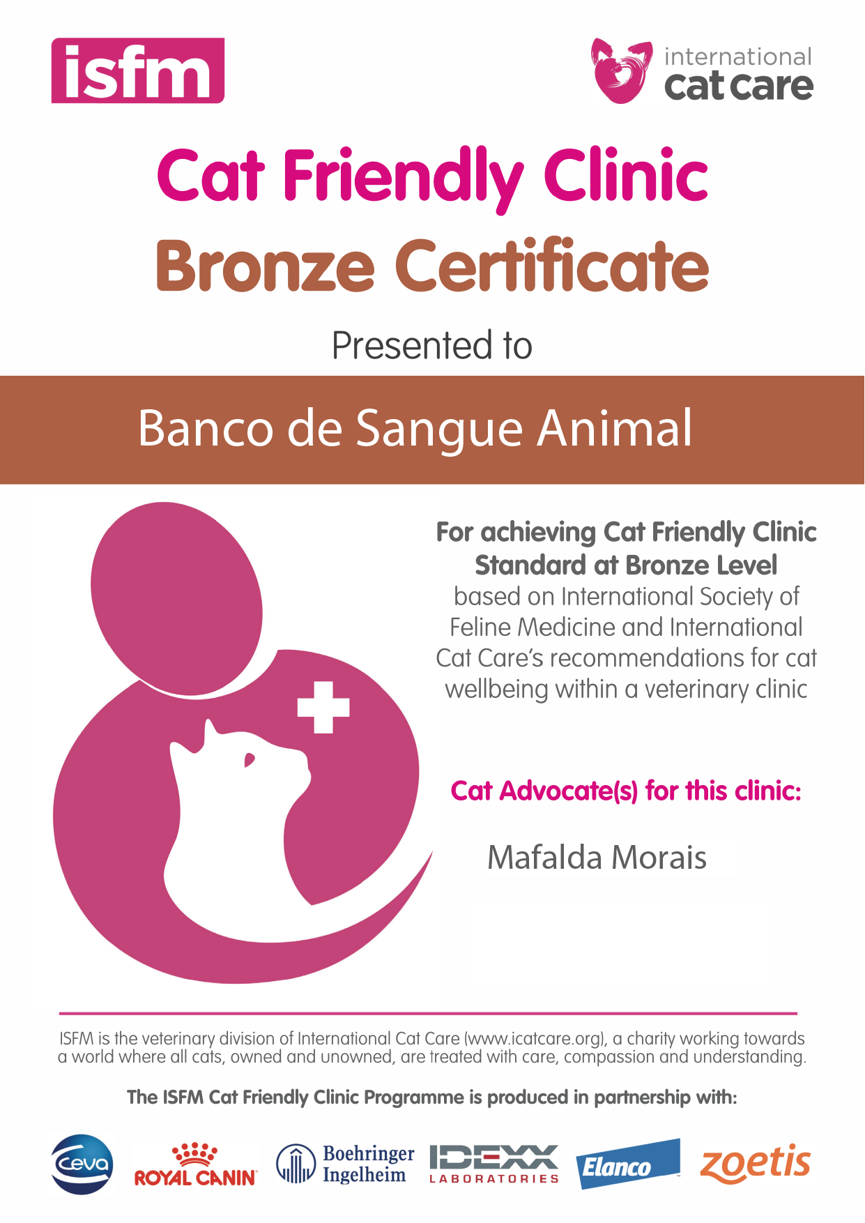 BSA is accredited as CAT FRIENDLY by the International Society of Feline Medicine, being the only Veterinary Blood Bank with such distinction.